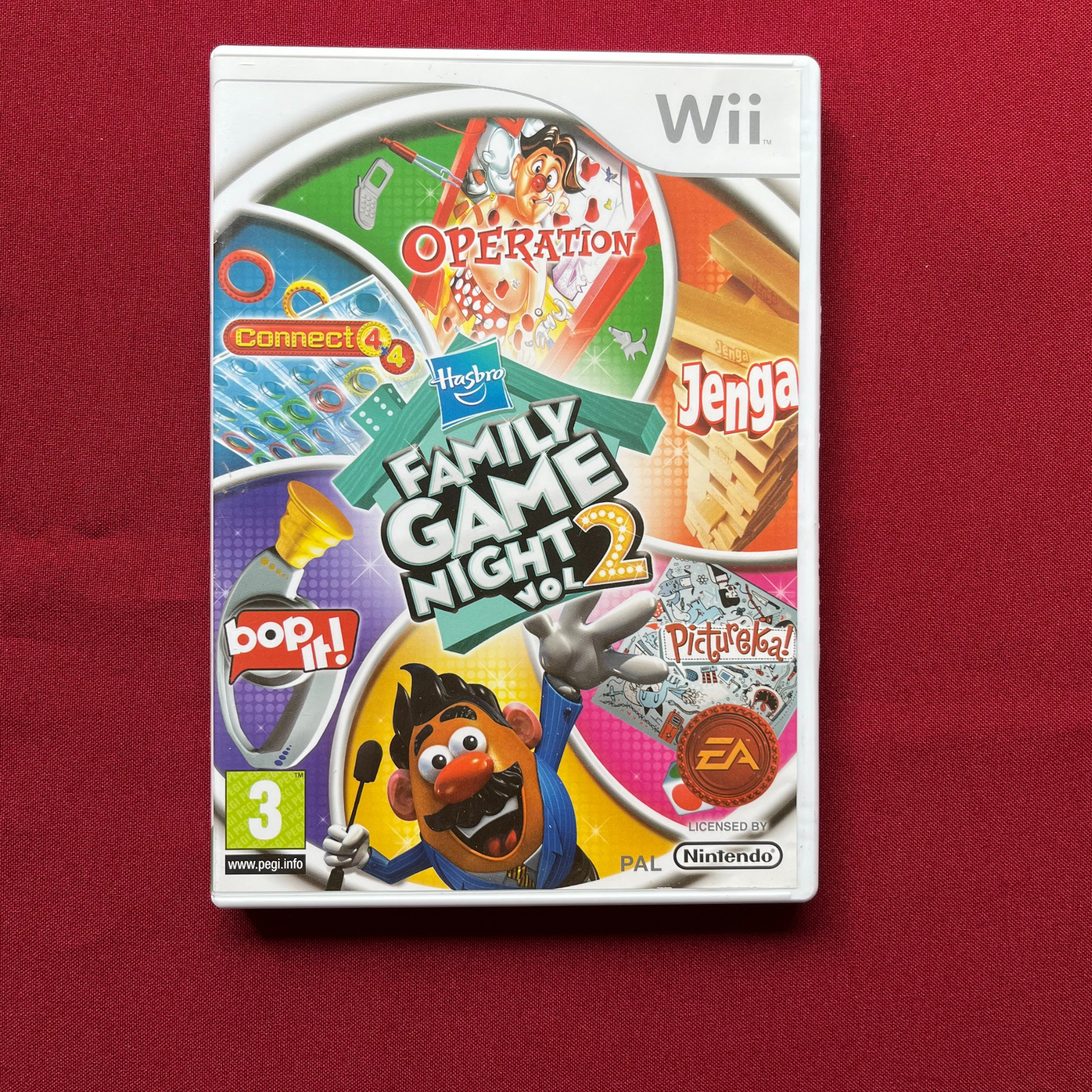 Plně funkční hra Hasbro Family Game Night 2 pro Nintendo Wii, v kompletním balení včetně krabičky a manuálů. PAL verze v AJ.